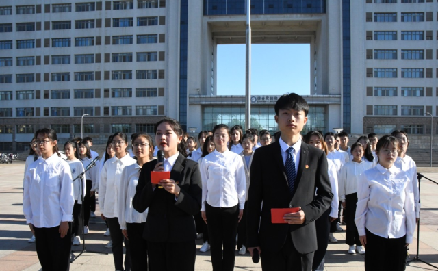 清晨七点整,升旗仪式正式开始。国旗护卫队迈着整齐有力的步伐,护送鲜艳的五星红旗入场。“升国旗,奏唱国歌,全体师生行注目礼!”伴随国歌奏响,全体师生以饱满的爱国热情注视着五星红旗冉冉升起,表达崇高敬意。追忆光辉历史,体味艰苦过往,员工代表袁千然进行演讲,她强调新时代青年要肩负历史使命,坚定前进信心,立大志,明大德,成大才,担大任,努力成为堪当民族复兴重任的时代新人。百年回眸,岁月悠悠,主持部成员朗诵诗歌《党史礼赞》,他们以真挚的情感讲述华夏故事,用铿锵有力的声音讲述党的记忆,表达了对党的无限崇敬。新时代,新未来,合唱部与手语部成员共同演绎歌曲《共筑中国梦》,歌声嘹亮,唱出了新时代的中国梦,激励同学们昂首启程,实现梦想。
