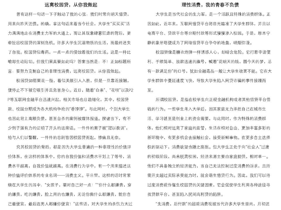 树立正确理财观念,警惕非法借贷陷阱。活动以征文形式进行,文字多样深刻。有的从校园贷微视频作品、网贷相关报道等入手进行论述,展现了校园贷的危害;有的从“校园贷对社会危害”调查数据展开,对应地提出了远离校园贷的措施;有的以生活中常见借贷手段为例,使同学们警惕生活中的借贷行为。其中,殷延薇同学以“远贷克己,悠然南山”为题,叙述了什么是校园贷,如何分辨不良网贷,强调了不良校园网贷的风险以及危害性,并在文章最后呼吁同学们远离校园贷,共筑美好未来。经过激烈的角逐,殷延薇获一等奖,陈筱雪获二等奖,刘文轩、王进、周小艺获三等奖。