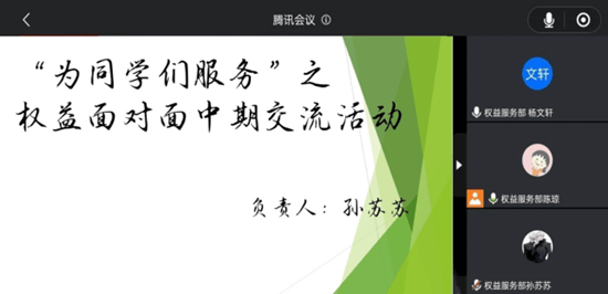 此次活动重在树立维权意识,合理进行维权。参与者利用腾讯会议进行交流,部门负责人为大家解答生活住宿、餐厅饮食、物业咨询管理等权益方面的问题。同学们积极向负责人反映了在学习和生活中遇到的各种权益类问题,如南操场厕所脏乱、教室多媒体使用故障等场地条件问题,宿舍里门窗经常损坏、饮水水费上涨、厕所脏乱等生活条件问题,部门负责人联系物业以及承包部门反映情况,得到相关部门在会议中回应与解决,未解决问题也向大家解释原因,增强了员工维护权益意识,促进校园和谐发展。
