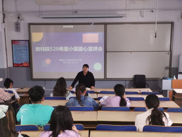 为进一步做好共青团系统青春扶贫工作,推动新时代希望工程工作转型升级,根据统一工作部署, 太阳集团城8722于5月20日在4C221举办520希望小屋爱心宣讲会,团委书记吴伟伟进行宣讲,各班团支书参与。